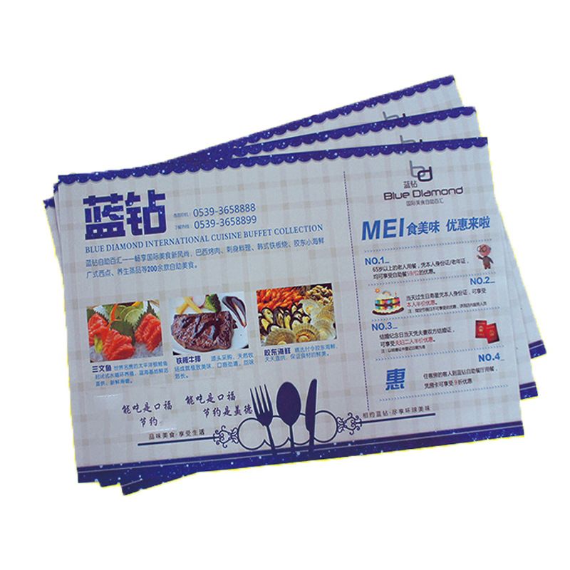 กระดาษอาหารค่ำจานอาหารค่ำแบบใช้แล้วทิ้งกระดาษสีกระดาษออฟเซ็ต placemat กระดาษเมนูการพิมพ์ตารางกระดาษแผ่นจานอาหารค่ำ